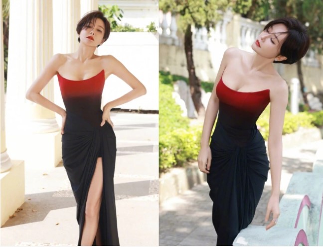The 45-year-old star appeared at a mainland fashion event in a red-and-black slit dress. Her neatly trimmed short hair and bold makeup with classic red lips immediately evoked images of the glamorous beauties from the golden era of Hong Kong cinema.